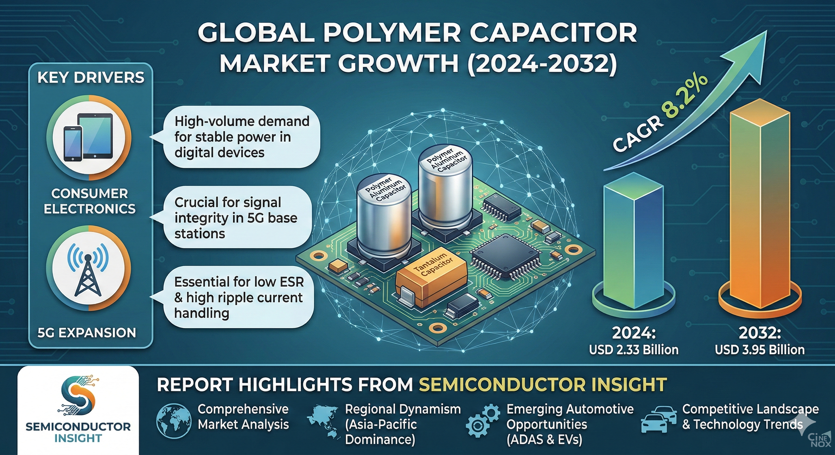 The global Polymer Capacitor Market is positioned for robust growth, projected to rise from USD 2.33 billion in 2024 to USD 3.95 billion by 2032, reflecting a CAGR of 8.2%. According to the latest research from Semiconductor Insight, this expansion is primarily fueled by the relentless demand for high-performance consumer electronics and the global rollout of 5G infrastructure.