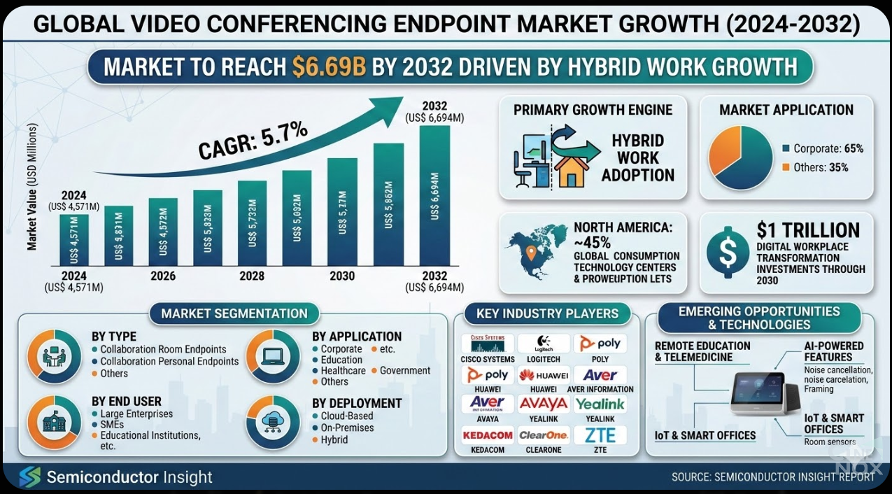 Video Conferencing Endpoint Market to Reach $6.69B by 2032 Driven by Hybrid Work Growth (85) The Video Conferencing Endpoint Market was valued at US$ 4,571 million in 2024 and is projected to reach US$ 6,694 million by 2032, growing at a CAGR of 5.7%. The market growth is largely driven by the increasing adoption of hybrid work models, which has significantly boosted demand for high-quality communication hardware across enterprises worldwide. Video conferencing endpoints—equipped with advanced features such as AI-powered framing, noise cancellation, and 4K video—play a crucial role in enabling seamless collaboration while reducing travel costs and improving operational efficiency. North America currently dominates the market, accounting for around 45% of global demand, supported by the strong presence of technology companies and enterprise headquarters. Corporate applications represent nearly 65% of the total market usage, highlighting the growing importance of unified communication systems in modern workplaces. In addition to corporate adoption, emerging opportunities are being created by remote education and telemedicine, which require reliable and high-quality video communication solutions. The integration of IoT and smart office technologies is also transforming conferencing environments, enabling intelligent endpoints that automate meeting setups and reduce IT support costs. Key companies such as Cisco, Logitech, Poly, Huawei, Yealink, and Avaya are focusing on AI integration, product innovation, and expansion in Asia-Pacific markets to strengthen their competitive position and capture new growth opportunities. Get Full Report Here: https://semiconductorinsight.com/report/video-conferencing-endpoint-market/ About Semiconductor Insight Semiconductor Insight is a leading provider of market intelligence and strategic consulting for the global semiconductor and high-technology industries. Our in-depth reports and analysis offer actionable insights to help businesses navigate complex market dynamics, identify growth opportunities, and make informed decisions. We are committed to delivering high-quality, data-driven research to our clients worldwide. 🌐 Website: https://semiconductorinsight.com/ 📞 International: +91 8087 99 2013 🔗 LinkedIn: Follow Us #VideoConferencing #VideoConferencingEndpoints #UnifiedCommunications #HybridWork #RemoteCollaboration #EnterpriseCommunication #Telemedicine #RemoteLearning #SmartOffices #AIinMeetings #DigitalWorkplace #BusinessCommunication #TechMarket #MarketResearch #SemiconductorInsight